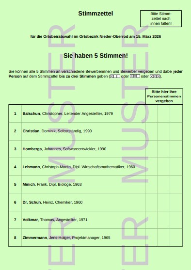 Den Musterstimmzettel für unseren Ortsbeirat habe ich hier eingefügt. Solltet ihr noch nähere Infos zu unseren Kandidaten brauchen, könnt ihr auf unserer eigenen Homepage unter dem folgenden Link https://www.nieder-oberrod.de/ortsbeiratswahl-2026/ ein Kurzprofil des entsprechenden Kandidaten aufrufen.